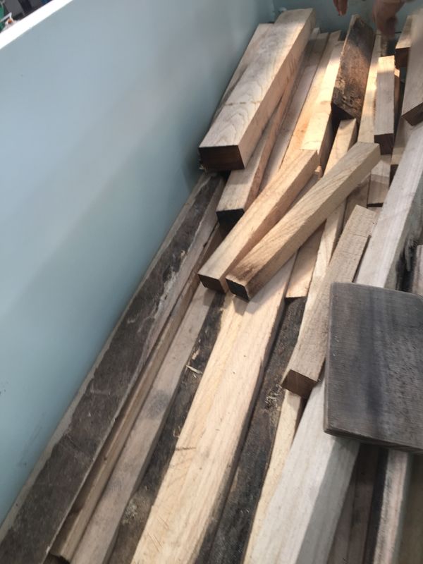 Bastoni di legno trattati, ramoscelli, rami, residui di legno nella rasatura.
